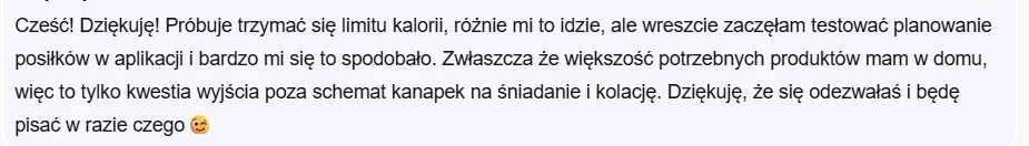 Dedykowana psychodietetyczka odpowie na czacie w aplikacji na Twoje pytania i pomoże dopasować proces zmian do siebie. Możesz wysłać nielimitowaną liczbę wiadomości tekstowych, plików czy zdjęć. Ekspertka odpowie na Twoje wiadomości wysłane od poniedziałku do piątku w czasie maksymalnie 48 godzin.