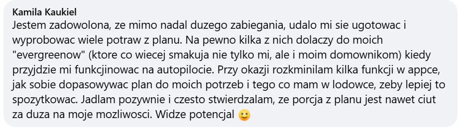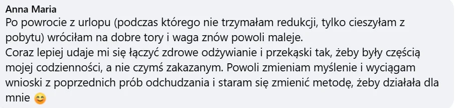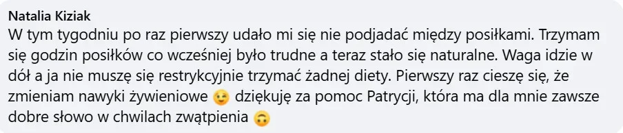 Jestem bardzo zadowolona. Jem z większą uważnością, lepiej kontroluję zachcianki, teraz mam raczej ochotę na zdrowe rzeczy, ale wiem, że zjedzenie okazjonalnie ciastka czy pizzy, jeżeli naprawdę będę miała ochotę, to nic złego i nie powinnam się obwiniać, że zrujnowałam całą pracę. Poleciłam kurs już kilku osobom, bo uważam, że jest to najlepszy sposób na odbudowanie relacji z jedzeniem :)