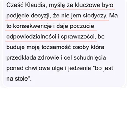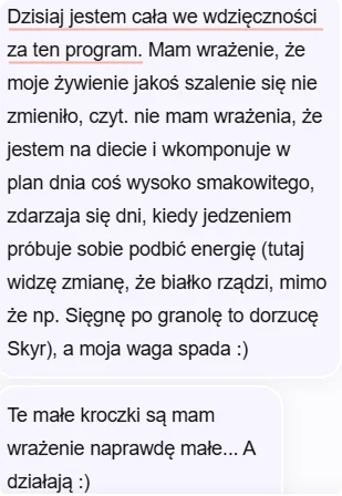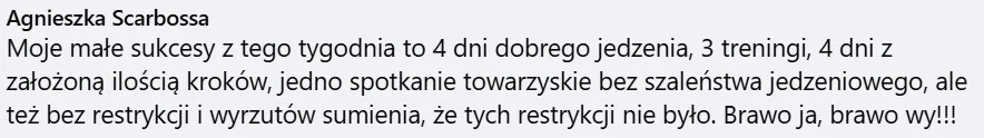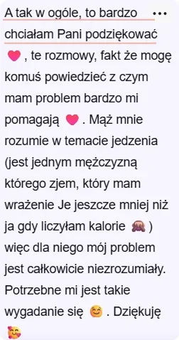 Chciałam naprawić swoją relację z jedzeniem. Najcenniejsza była duża dawka wiedzy dot. schematów w naszej głowie, jak działa mózg i jak to wpływa na relację z jedzeniem. Dało mi wolną głowę od myślenia o jedzeniu i o swoim wyglądzie. Nareszcie cieszę się życiem i jedzeniem. Nie mam wyrzutów sumienia, gdy zjem loda, na którego miałam ochotę. To jest wolność 😍