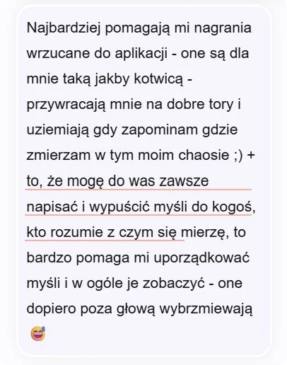z tego, co robię. I to morze zrozumienia i tego, że nie musisz wszystkiego tłumaczyć, bo pozostali uczestnicy też tak mają! Nie jest łatwo, nie jest idealnie, ale głowa zaczyna myśleć inaczej. Magda i dziewczyny prowadzą nas do szczęścia, do tego, jak je dostrzegać. I dzięki temu, że Magda nas wysłuchała, zostaje w tej grupie wspierających ludzi w jeszcze kolejnych meetach. Nic się nie zmieni, dopóki nic nie zmienisz.