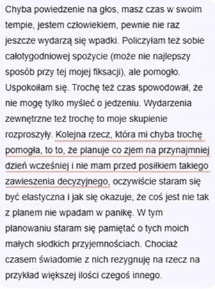 Dzięki KSO zupełnie zmieniło się moje podejście do jedzenia. Już nie rzucam się na makaron z serem, nie objadam pod korek w każdej, co bardziej nerwowej sytuacji.