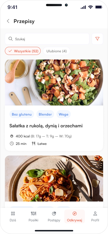 W aplikacji znajdziesz ponad 160 filtrów, dzięki którym w łatwy sposób znajdziesz posiłek dostosowany do Twoich potrzeb.