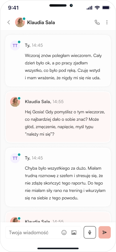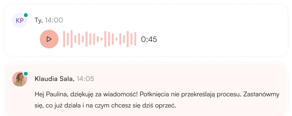 Napisz do swojej dedykowanej psychodietetyczki na czacie lub nagraj głosówkę.