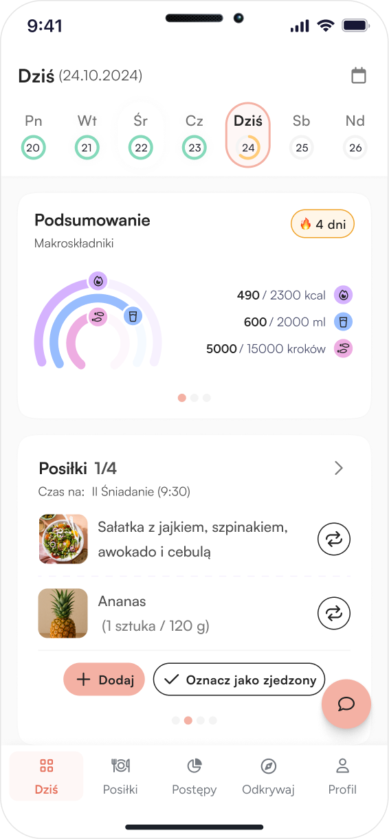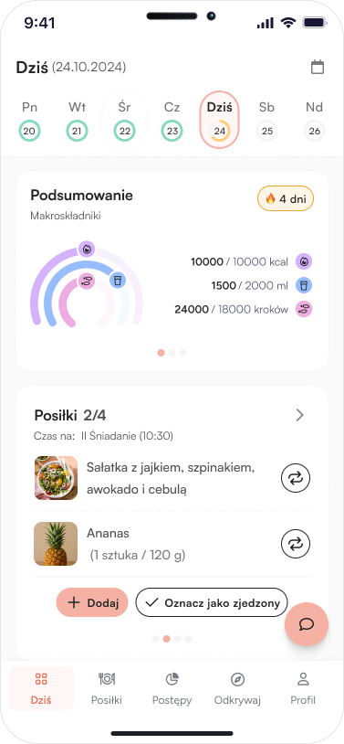 Aplikacja Twoim Tempem dostosuje się do Ciebie, dając elastyczne formy wpisywania posiłków do aplikacji, układania jadłospisu i śledzenia każdego kroku Twojego procesu zmiany.