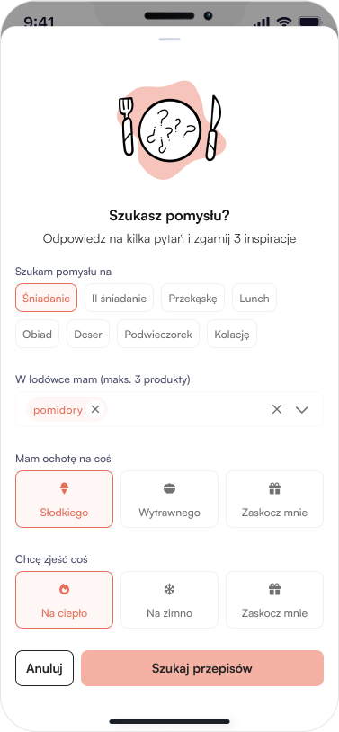 Codzienne wsparcie w gotowaniuAsystent pomoże Ci dobrać przepisy do składników, które masz pod ręką. Dzięki temu nauczysz się jeść i gotować zdrowiej, nawet gdy masz mało czasu lub energii, bo pracujesz z tym, co masz!