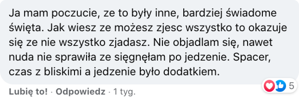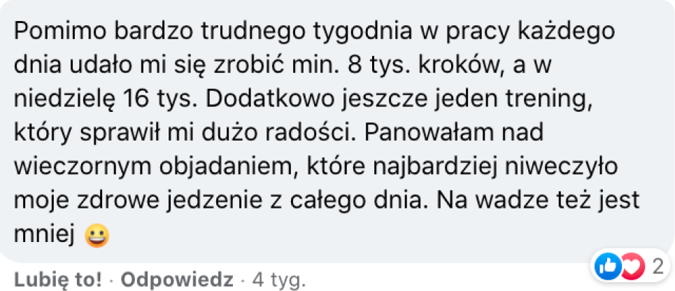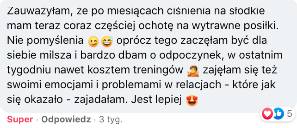 Jestem bardzo zadowolona. Jem z większą uważnością, lepiej kontroluję zachcianki, teraz mam raczej ochotę na zdrowe rzeczy, ale wiem, że zjedzenie okazjonalnie ciastka czy pizzy, jeżeli naprawdę będę miała ochotę, to nic złego i nie powinnam się obwiniać, że zrujnowałam całą pracę. Poleciłam kurs już kilku osobom, bo uważam, że jest to najlepszy sposób na odbudowanie relacji z jedzeniem :)