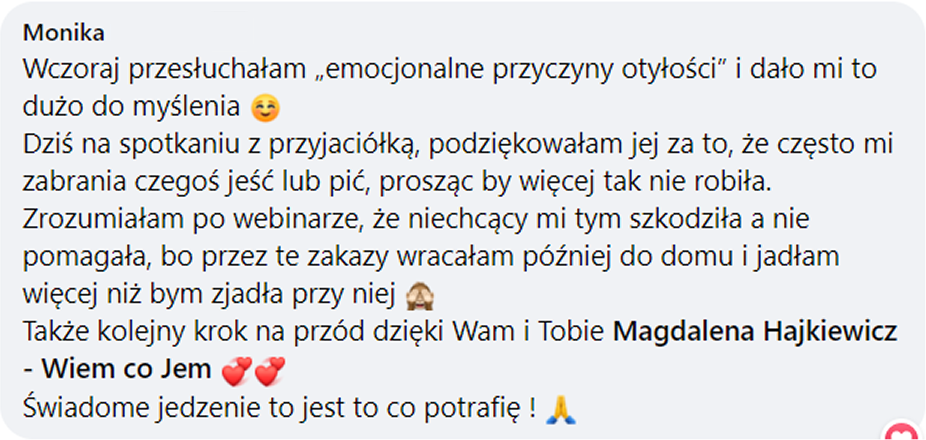 Kurs dał mi ogromne WSPARCIE. Dzięki kursowi zaczęłam dostrzegać swoje emocje, akceptować je i daję im ujście w inny sposób niż jedzenie.