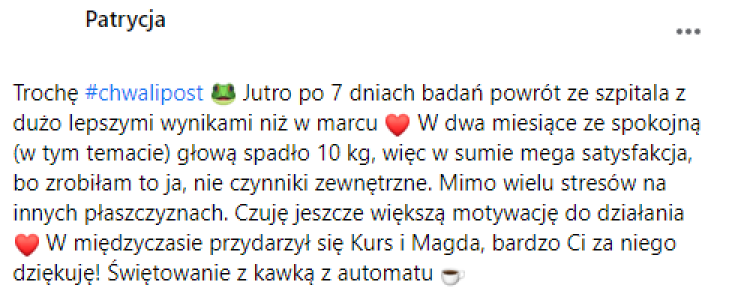 "Dzięki udziałowi w KSO porzuciłam diety i ...schudłam 20 kg mimo. Dzięki temu, że stoi za tym zmiana stylu życia, efekty ze mną zostały."